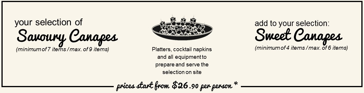 → Choose your savoury canapes selection – minimum of 7 items (included in the package) and maximum of 9 items (additional cost)