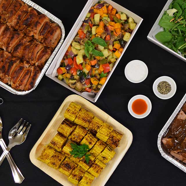 ♦ We deliver the meat selection and hot dishes in aluminum trays with lids, and salad selection in bowls, also providing the serving utensils, so there is no washing up after your meal!