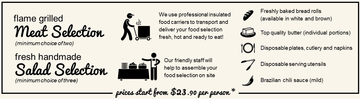 Simply order your Brazilian BBQ food selection online, tell us where and what time you would like to have the food served, and we arrive with everything you need to have a great meal, take the stress out and impress your guests. You will be left with great memories of food and service without the fuss!